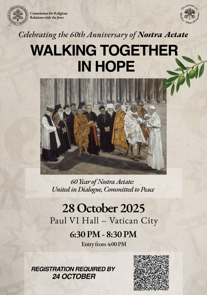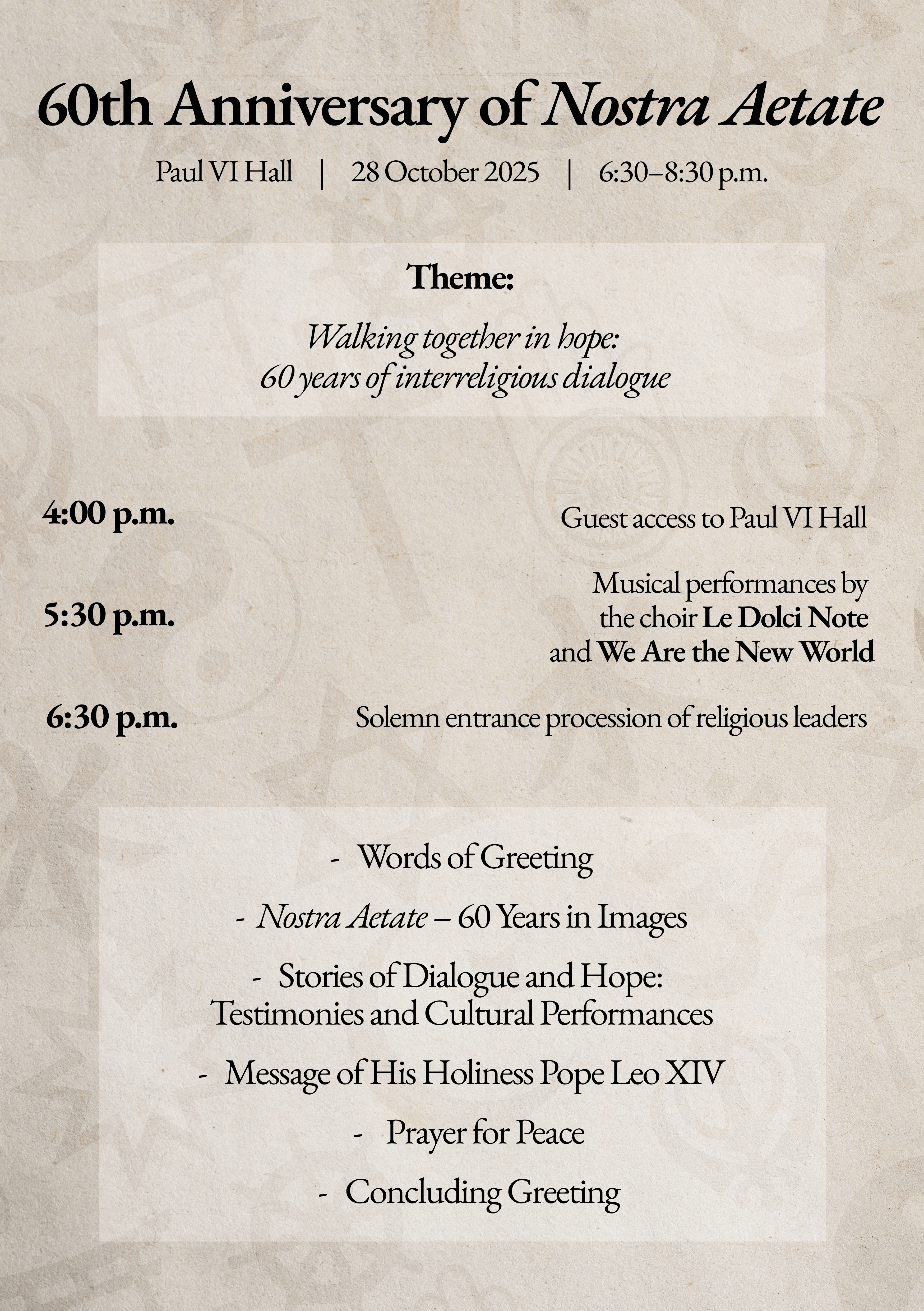 Under the theme “Walking Together in Hope”, this event celebrates six decades of dialogue, fraternity, and mutual understanding among people of different faiths. The evening will include musical performances, testimonies, and reflections that honor the enduring spirit of Nostra Aetate — one of openness, fraternity, and peace.
